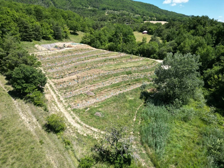 À travers ce projet, réalisé conjointement avec le bureau d'étude des Alvéoles, notre intention était de créer un verger de vignes, multi-étagé, adapté aux changements climatiques, viable économiquement sur une prairie maigre, dans un climat sec et froid.